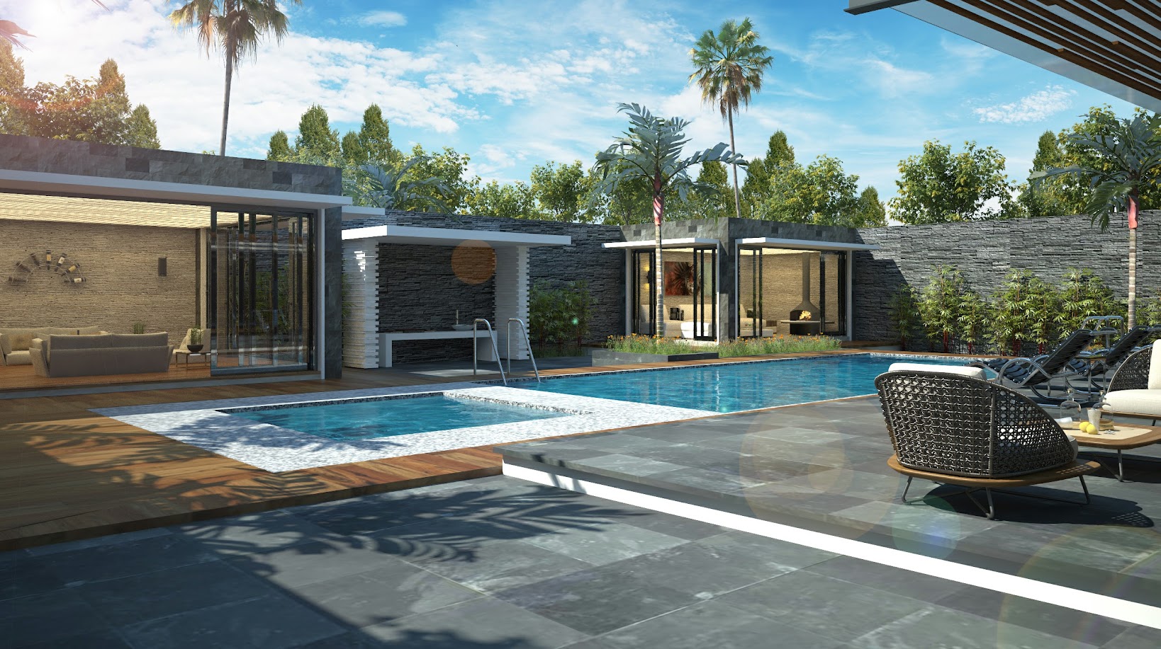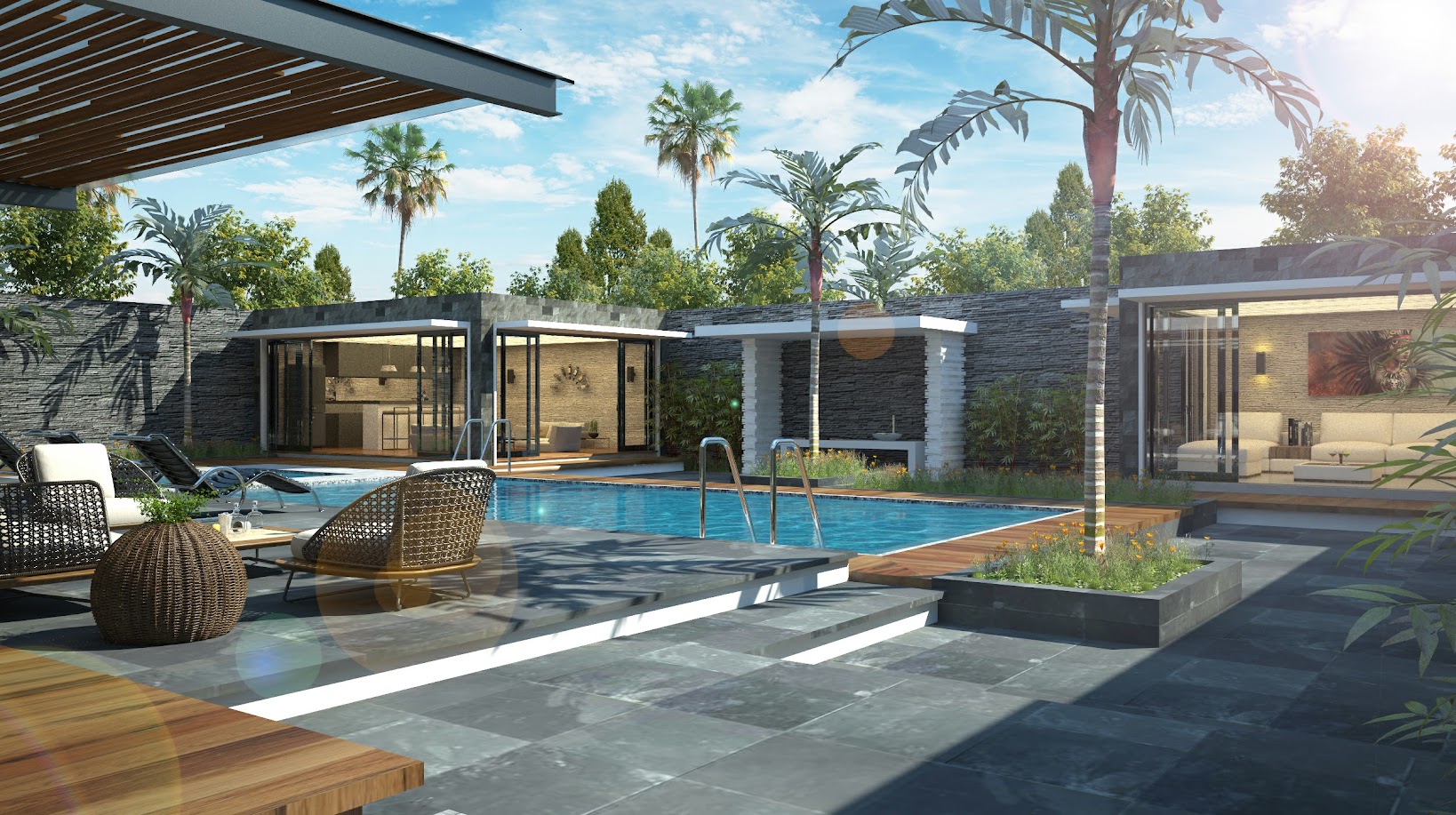 Dans un paysage ouvert et ensoleillé, cette résidence privée s’intègre dans son site naturel. En sculptant des murs monolithiques habillés de matériaux variés surmontés d’une toiture béton flottante et délicate, elle s’organise autour d’un jardin intérieur planté et aquatique, s’ouvrant généreusement sur la piscine et l’espace de réception pour un cadre de vie introspectif et fluide.