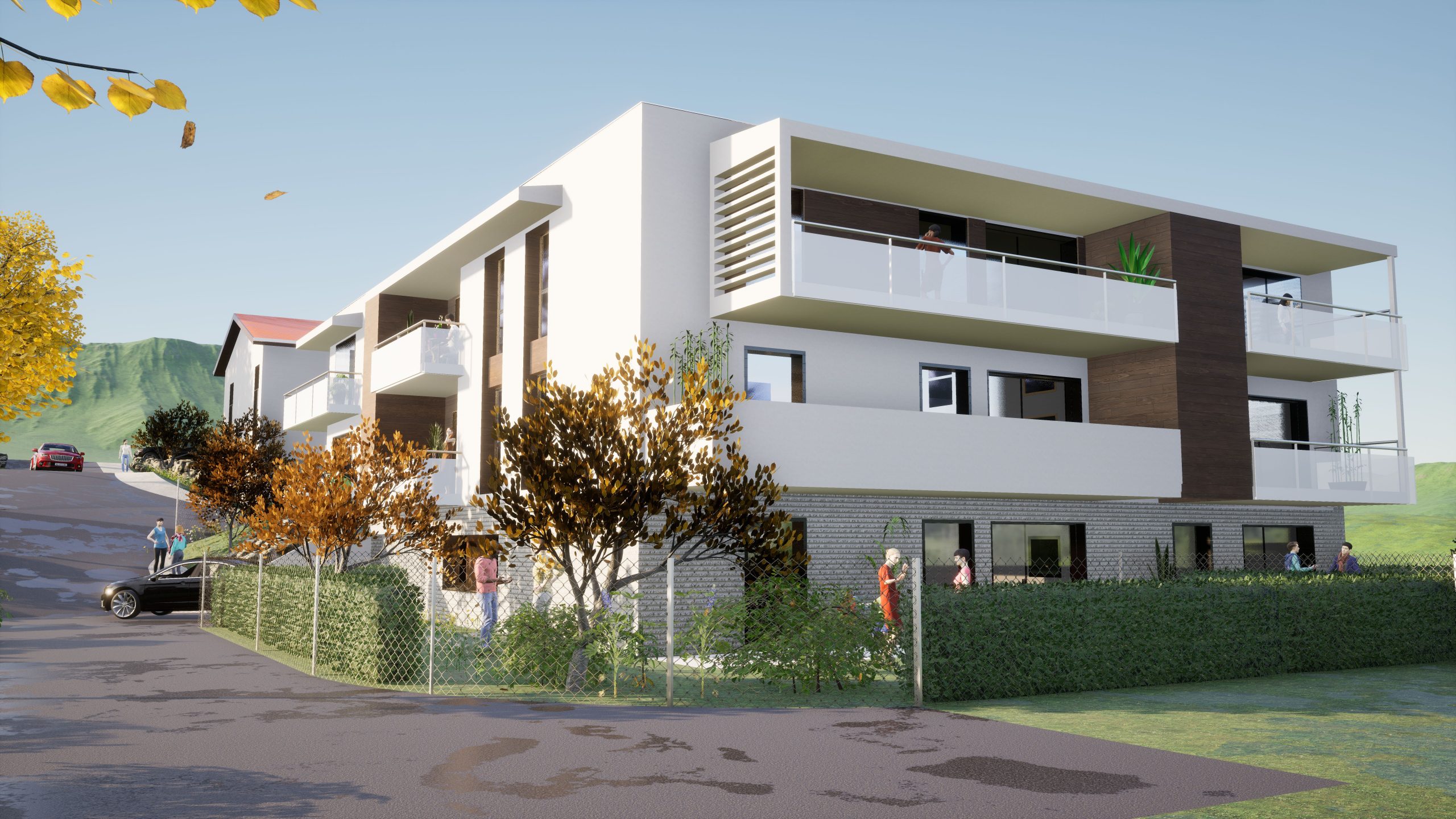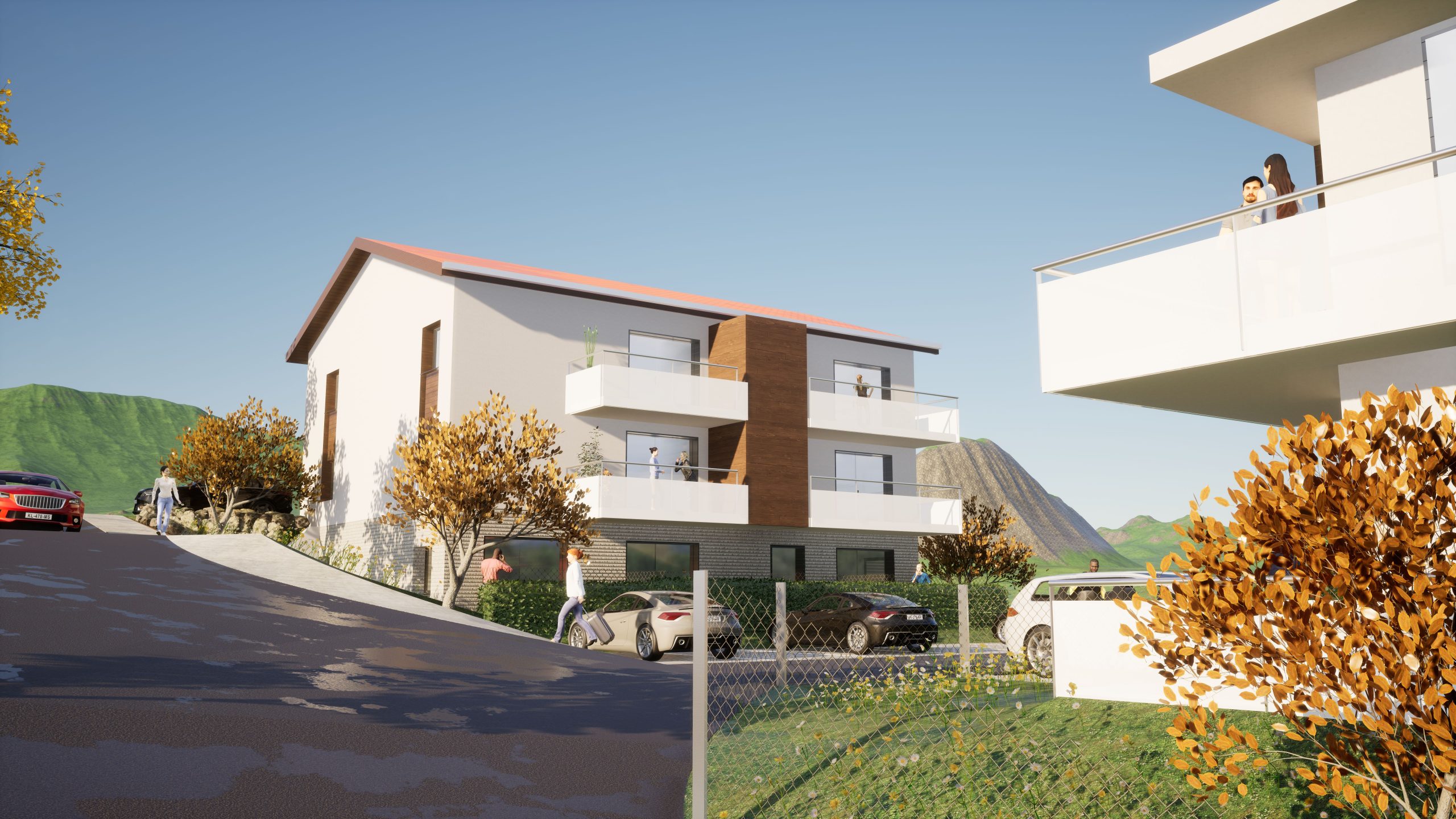 Ce duo de bâtiments s’harmonise parfaitement avec l’environnement bâti de Montbonnot-Saint-Martin. Grâce à des formes épurées et ordonnées, agrémentées de tuiles et d’huisseries dans des nuances coordonnées, il instaure des échos discrets entre les édifices, tout en soulignant leur singularité pour une composition unifiée et dynamique.