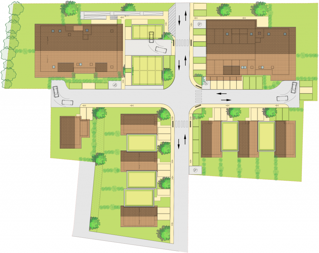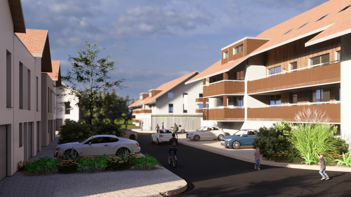 Dans un cœur d’îlot verdoyant à Yenne, ce projet de 2 bâtiments collectifs et 7 maisons se fond dans le tissu environnant. En structurant l’espace autour d’un réseau de chemins piétons et pistes cyclables menant aux commerces, écoles et transports, il crée une composition variée et poreuse. Les aménagements paysagers diffus favorisent une vie quotidienne fluide, conviviale et ancrée dans le paysage.