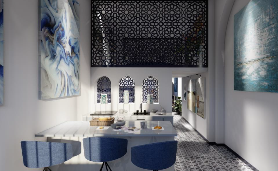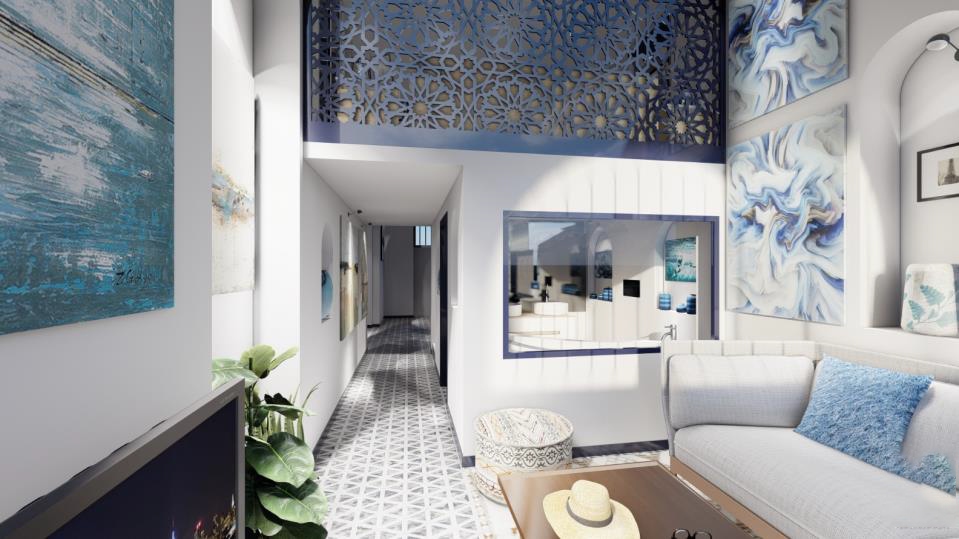 L’atelier fait office de galerie, mettant en valeur des sculptures en terre traditionnelle ainsi que des peintures d’artistes d’Essaouira. L’intérieur, sobre et lumineux, associe murs blancs et touches de bleu, avec des niches intégrées pour l’exposition. À l’entrée, une cuisine, un bar et un coin salon accueillent les visiteurs, prolongés par un séjour ouvert sur une grande baie vitrée.