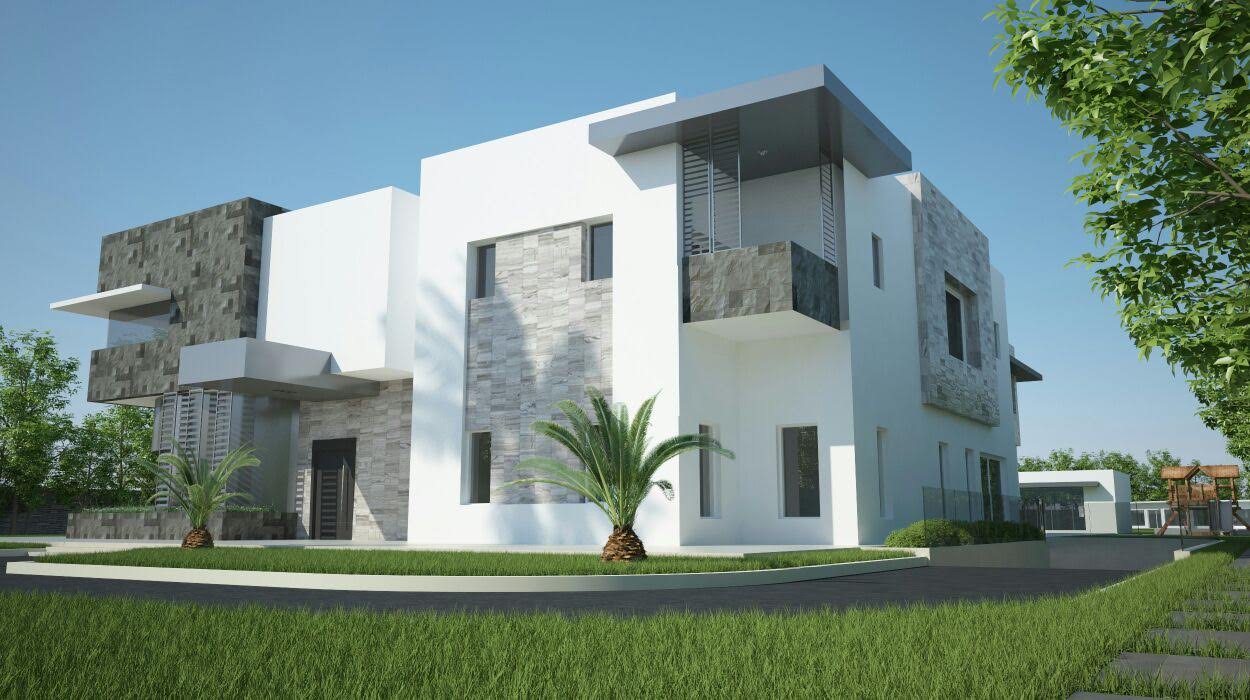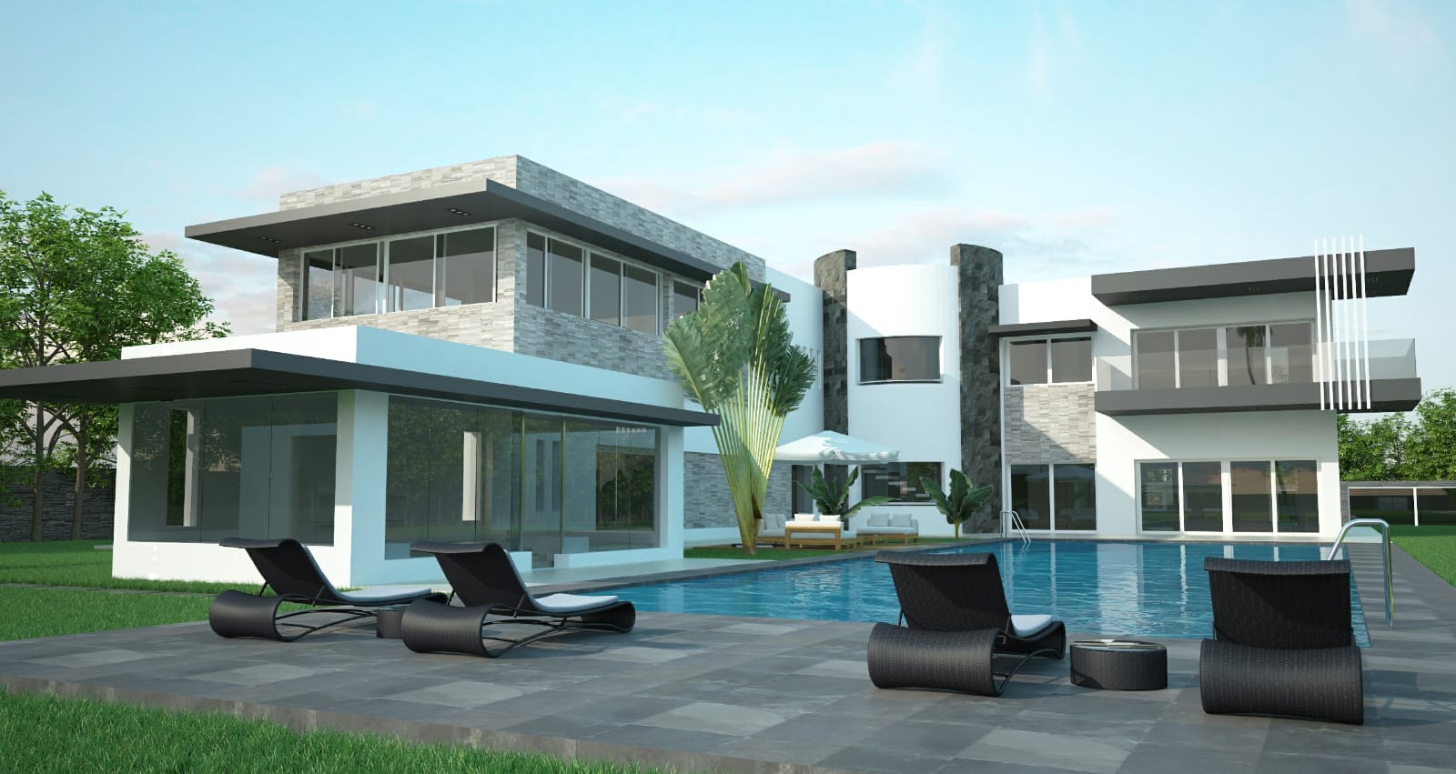 Villa contemporaine de 1000 m² avec grande piscine face aux montagnes enneigées de l’Atlas. Réception spacieuse au rez-de-chaussée avec coin feu et vues extravagantes ; chambres et salle de sport panoramique à l’étage. Maison d’invités à toiture inclinée béton, murs arrondis et grandes baies, avec paillote et garage. Façades en enduit ocre terre locale et pierre patrimoniale, mêlant modernité et héritage régional.